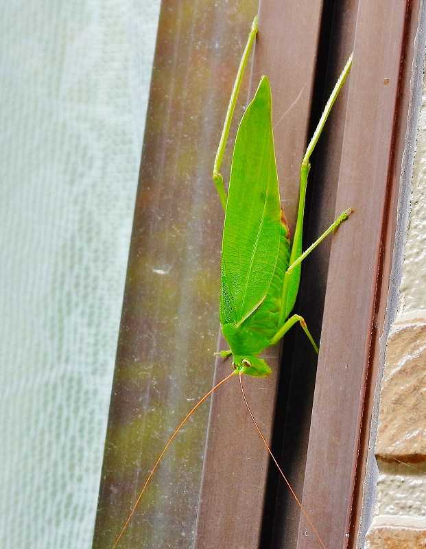だいぶ秋らしくなりました。窓ガラスにキリギリスがとまりました。キリギリスの仲間ですホオズキも赤くなりましたアサガオ庭のヒガンバナ