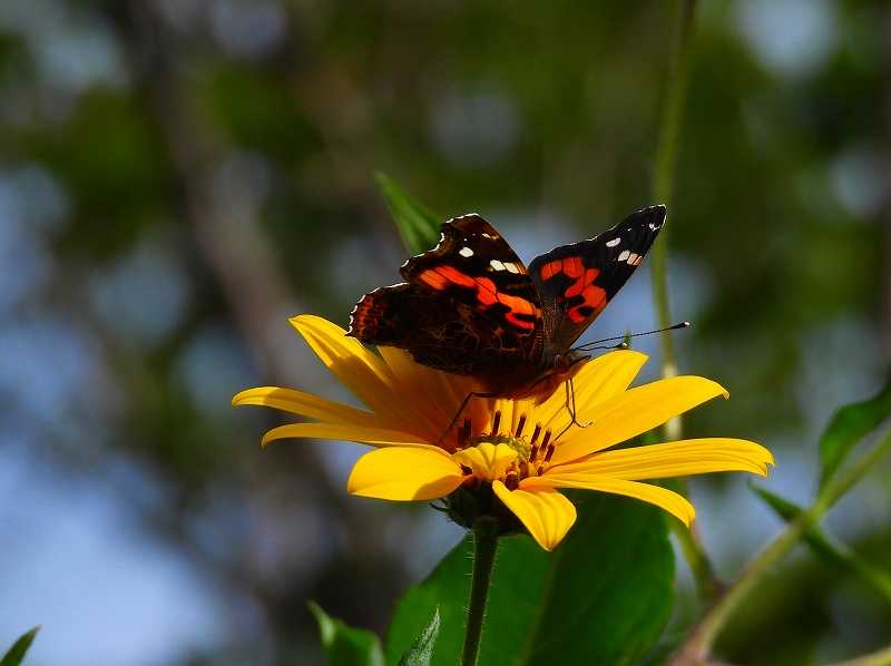 庭のキクイモの花が真っ盛りです。花が咲くとチョウたちが集まってきます。アカタテハキタテハモンシロチョウ