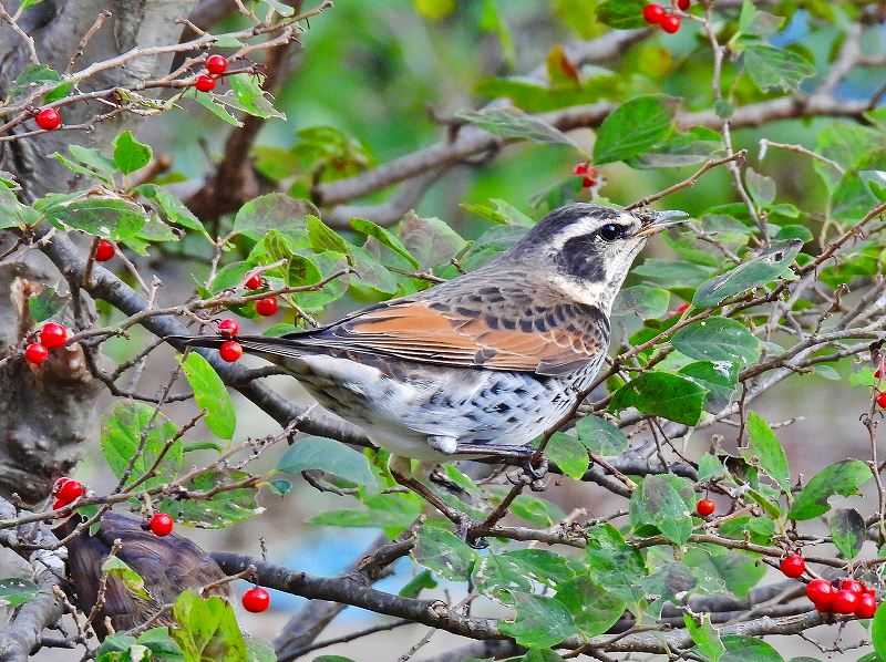 我が家の庭にはツグミが居座っていて、驚かせまいと土とに出ないようにしています。1羽です。 赤い実はウメモドキです。家の窓越しに撮っています