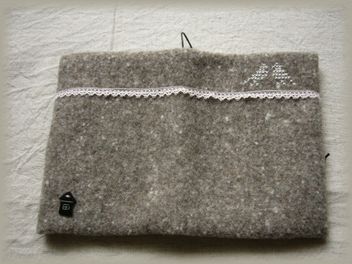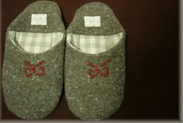 ココアシュガー色の厚手のウールにクロスステッチで刺繍を施してバブーシュを作りました。(画像が暗いです・・冬の新潟はほとんど晴れる日がないので明るく写せませんでした(><)実物はキレイなココアシュガー色です)「赤のリボン」を思い切って真ん中に持ってきたら“おんなのこの可愛い靴”ってイメージになりました。内布はリネンのブロックチェック。もうひとつは、スモークかかったピンク色の刺繍糸でお花、片方はつぼみです。このルームシューズを履くとピンク色のトーションレースの上にかかとをのせることに。可愛いツートンのレースを踏むなんて、ちょっぴり心苦しいのですが、、お部屋の片隅にちょこんと置いてるときや履く前の一瞬で「やっぱり可愛い♪」と思えちゃいます^^^底は合成皮革なのでフローリングの床でもすべりにくいです。キルト芯を2枚重ねしているので、ふかふかしています。**寒い冬の日、おうちでも足元を可愛く演出♪です。。。