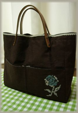 オーダー頂いていたバッグがようやく完成しました。イベントが終わってからでいいよー、との言葉に甘えさせてもらってずいぶんお待たせしちゃいました^^;ここ最近、太陽が顔を出さない日が多いので画像が少し暗くなっちゃいました・・お料理教室用バッグです。調味料を入れて持ち歩く、とのことだったので、万一、汚れてしまっても、サッとふけるように内布はラミネート加工の花柄に。そして、、、、、、、、!クロスステッチで薔薇のお花を刺してみました^^1色じゃシンプルすぎるので、落ち着いた雰囲気の2色をセレクト。とても上品なバッグに出来上がったなぁと思います。裏側が無地じゃ寂しいのでちょこっとアクセントを^^今回、内側の布から決まったので、表布を何にしようか・・・色も素材も迷いましたが、肌触りもいいし、見た目も高級感あるし、やっぱりリネンに。いつも、結局リネンに落ち着いちゃいます。麻100%のショコラリネン。重たいものを入れても耐えられるように、持ち手は本革にし、キルト芯でくるんだ底板をのせました。そして、バッグが自立するよう、バッグ用接着芯を貼りました。置いてもふにゃっとせず、シャキッ!となってて嬉しい~^^マグネットボタンで開け閉めします。A4サイズのクリアファイルが横向きに入るので、レシピも収納OK♪気に入ってもらえますよーに・・・・^^**参考パターン:unasara*さん刺繍:「ステッチ・あきふゆ」