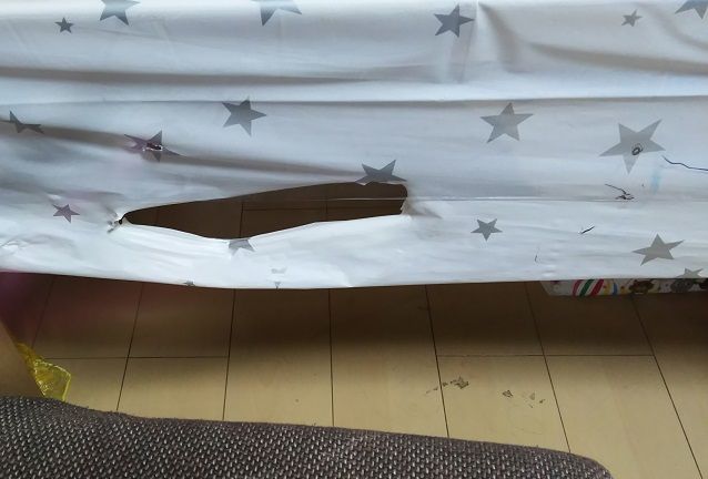うちのダイニングのテーブル。各々が私物を置くので、いつでもぐしゃぐしゃー。(苦笑)自宅で揃って食事をするタイミングがないのでテーブルなのに物置にされちゃうのよね…。まぁ仕方ない。(^^;それはそれとして、年末年始の大掃除で一旦リセットをかけたのですよ。テーブルクロスも新しい物を買ってきて、スッキリ!!(≧◇≦)だったのにー。1ヶ月たたないうちに、破れてる~。(-”-;)イタズラ書き程度なら別に良いと思っていた。でもさすがにこんなに大きな穴を開けられるとは思ってなかったよ。(^^;かあちゃんビックリだよ!!ふむ、とりあえず事故なのか故意なのかを本人に確認してみようかな。