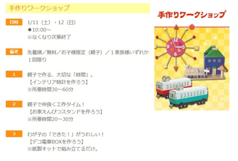 土曜の夜、明日の用事が何もなかったので「何か楽しそうなことはないかなー」と探していて見つけたのが、住宅展示場でやってた新春イベント。えんぴつスタンドが可愛い!って思ってチビに知らせると「時計が作りたい♪(^^)」って。うーん、残念。趣味が合わないなぁ。(・_・、)でもまぁ、目的が決まったので、「先着順だから早めに行こうね」って約束して就寝。当日の朝、案の定 夜更かししてたチビは眠そうだったけど目的がハッキリしていたため、支度に入ったらキビキビ。(笑)気温が低く感じたので、私の防寒の方が時間がかかってしまった。r(^^;何とか到着して、ワークショップへ。作業台に空きがなかったので順番待ち。その間にスタンプラリーとかやって、キャラクターショーがはじまり子供たちが減ったところを狙って作業に入る。(笑)作業場は外。(^^;寒かったけど、風がなかったから助かった・・・。色塗りに結構時間がかかって、時計部分は家に買ってから装着することに。じゃじゃーん!(≧◇≦) 飾ってみたよ♪手作り感、満載。(爆)楽しい時間でした♪ ( ̄∇ ̄)ノ