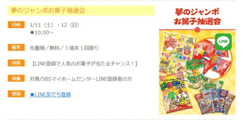 チビのワークショップに出かけたらこんなのもやってた。せっかく早めに到着したし・・・、と列に並んでみる。(笑)1端末1回だったので、私と父ちゃんと1回ずつやらせてもらえた。(^^)チビはチュッパチャプスが当たりましたよ。15本も入っていたらしい。私はLINE登録が上手くできなくてモタモタしたのでチビにクジを引かせてあげられなくて、別行動になって私がクジを引いて、うまい棒が当たりましたー。コアラのマーチが良かったな、なんて。(笑)40本入りだって。すごい~♪ (^^)しばらくはおやつに困らないなぁ。(笑)