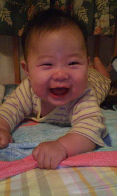 我が家の三男は今日で4ヶ月になりました日向(ひなた)です足の力がとても強くて、蹴りながら前に移動していたりいつの間にか向きを変えていたりしています。あと小さなおもちゃなんかも自分から掴むようになりました最近は授乳の時に歯茎で乳首を噛まれますまだ歯は生えていないけどスゴク痛いです歯茎でも痒いのかな明日は、市で行う4ヶ月検診に行ってきますどのくらい大きくなっているか楽しみです私は三男と一緒に寝ているのですが、ちゃんと布団掛かっているかな~と気になり、夜中に2~3回くらい起きてしまいます。だから最近、ちゃんと寝た気がしません朝まで、ぐっすり寝たいなぁ。。。。。