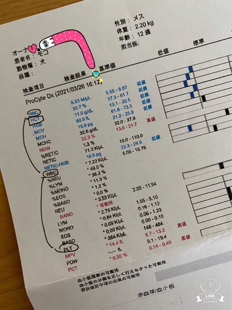 今年3月の検査で 貧血が分かったモコ… 本日再検査。 怖いね でも大丈夫。 結果は… やはり貧血でした。 数値から 1日に約20㎖の血液が奪われている計算になると… 言葉が見つかりませんでした。 しかも モコの場合 炎症の数値を表す 「CRP」が異常値を示し からだのどこかで 炎症を起こしている可能性があるとのこと。 ところが 一緒におこなった他の検査で 主に疑われる病気が見当たらず 原因となる疾患が 特定出来ませんでした。 そこで 先生からの提案で 抗生剤で少し様子を見させてほしいと… 肝臓などに 負担がかかってしまうそうなのですが 幸いモコは 貧血以外は どこにも異常がないとのことで お薬を投与しても 大丈夫ではないかと… 生前のラッキーのこともあって あまり薬は飲ませたくはなかったのですが 先生を信じることに。 朝と夜に1回ずつ 6日間飲ませます。 そして7日目に もう一度血液検査を することになりました。 最後に先生から 貧血ではあるけれど 他の数値から モコのからだの中で 一生懸命 血を作ろうとしている様子が見て取れる と伺い なんだかせつなくなりました。 それを邪魔しているのは 一体誰なんだ~ モコがんばろうね! どうか お薬が効きますように。 訪問いただきましてありがとうございます