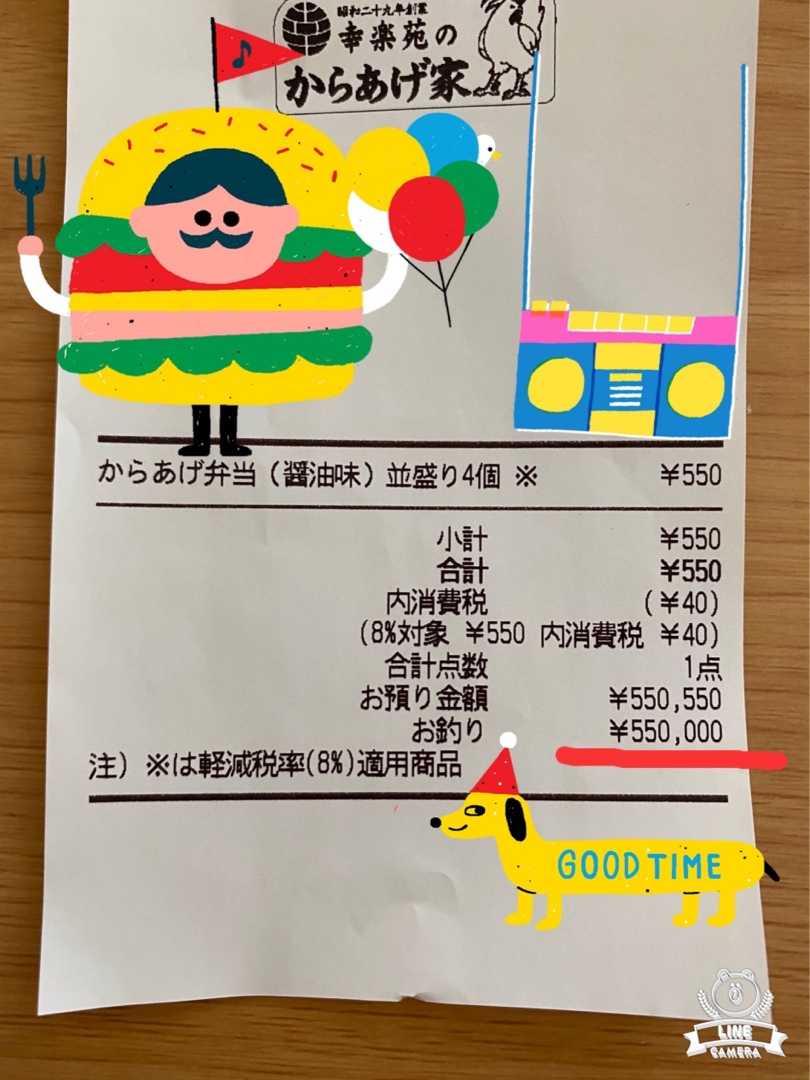 今日、主人がテイクアウト唐揚げ専門店でお弁当を1個購入した時のこと…並盛り弁当を注文し料金550円ちょうど支払い会計を待っているとなにやら店員さんの様子がおかしい「あの… こうなってますけど 間違いなく ちょうどお支払い頂いたので」 手渡されたレシートを見て驚愕したそうです。え…すごい…55万円以上支払ったことになってる訪問いただきましてありがとうございます