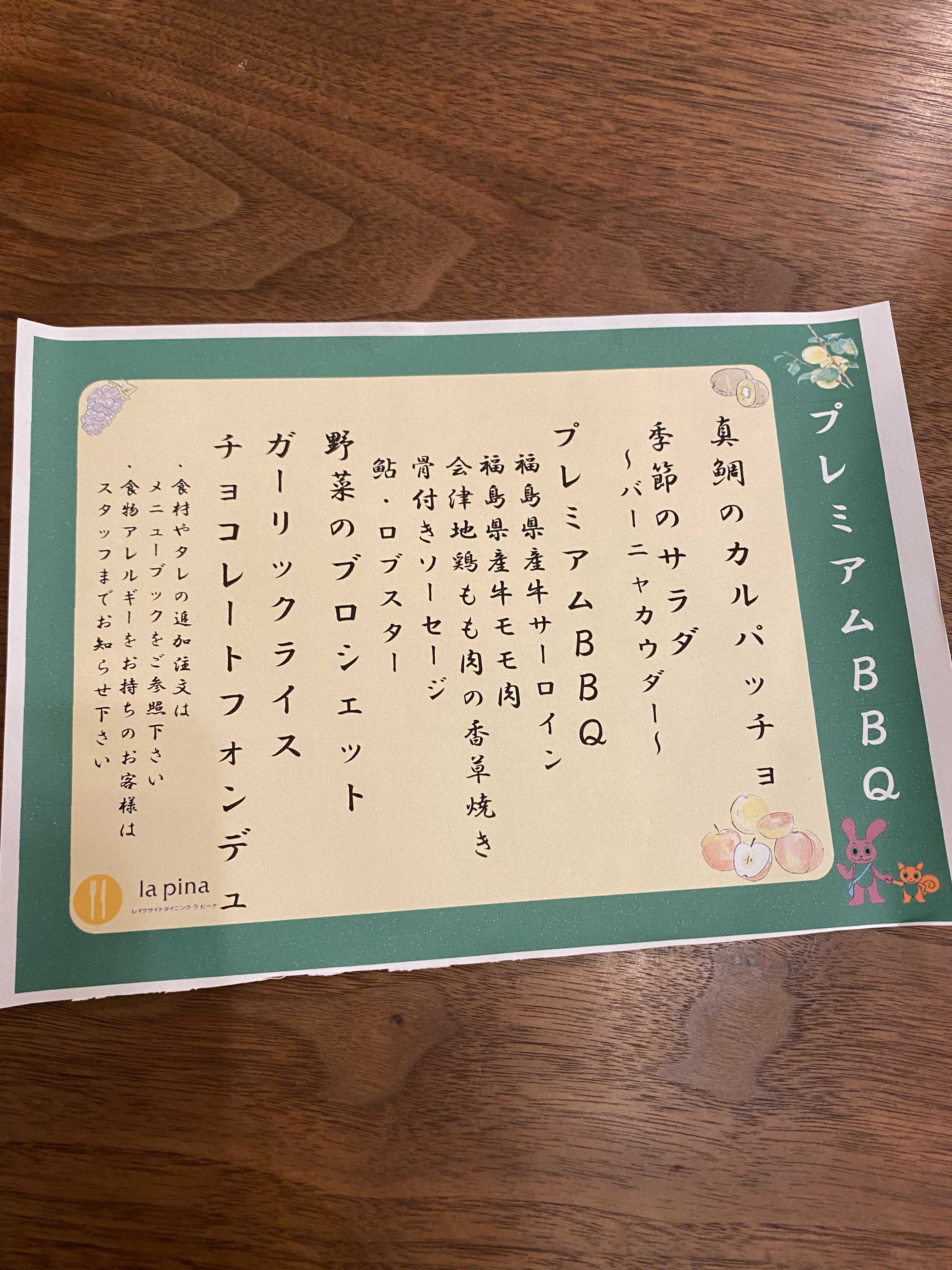 本日のお品書きです♪豪華過ぎます!それに憧れの外での食事テンションが上がらない訳がないこれは何という名称なんでしょうか。。。取っ手付きのこの黒い??こちらでお料理を煮たり焼いたりして頂きます。炭はすぐそばの円柱の容器にすでにセットされています。もちろん屋根付きなので安心して食事を楽しめます。さあテーブルの上に色々と準備していきます。並べているだけでよだれが・・・先程の炭入りの容器をこんな感じで乗せて火を起こします。あら くまちゃん野菜の串焼きそして黒いお鍋にはバーニャカウダが♪肝心なメインのお肉夢中になり過ぎて写真撮るのを忘れてしまいました写っているのはハッと気付いてから撮ったほとんど残っていないお肉。。。笑あらまたまたくまちゃんこんな所に居たの?さらにテーブルの下でわちゃわちゃするモコとくまごろうモコちゃんもカメラに向かってニッコリしてくれましたそしてそして最後の〆はお楽しみのデザート♪チョコレートフォンデュです💕とにかく大満足のお食事でしたもうお腹がいっぱいです。それに外で食べるのってこんなにワクワクするものなのかと♪本当に美味しくて楽しい時間を過ごせました続く...。訪問いただきましてありがとうございますエンゼルフォレスト白河高原(旧:エンゼルフォレスト那須白河)