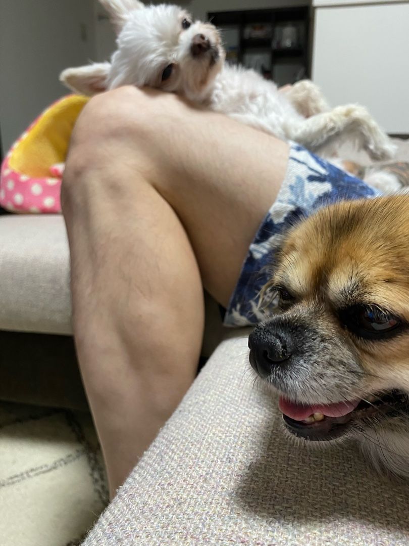 主人が帰ってくるとモコとくまごろうはいつもこんな感じでべったり。「おーい。くまちゃんはどこ見てるの?」「私のとなり空いてますよ~」というとモコがチラッ…笑訪問いただきましてありがとうございます