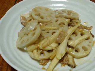 さらに豚肉、エリンギ、れんこんを炒めます。