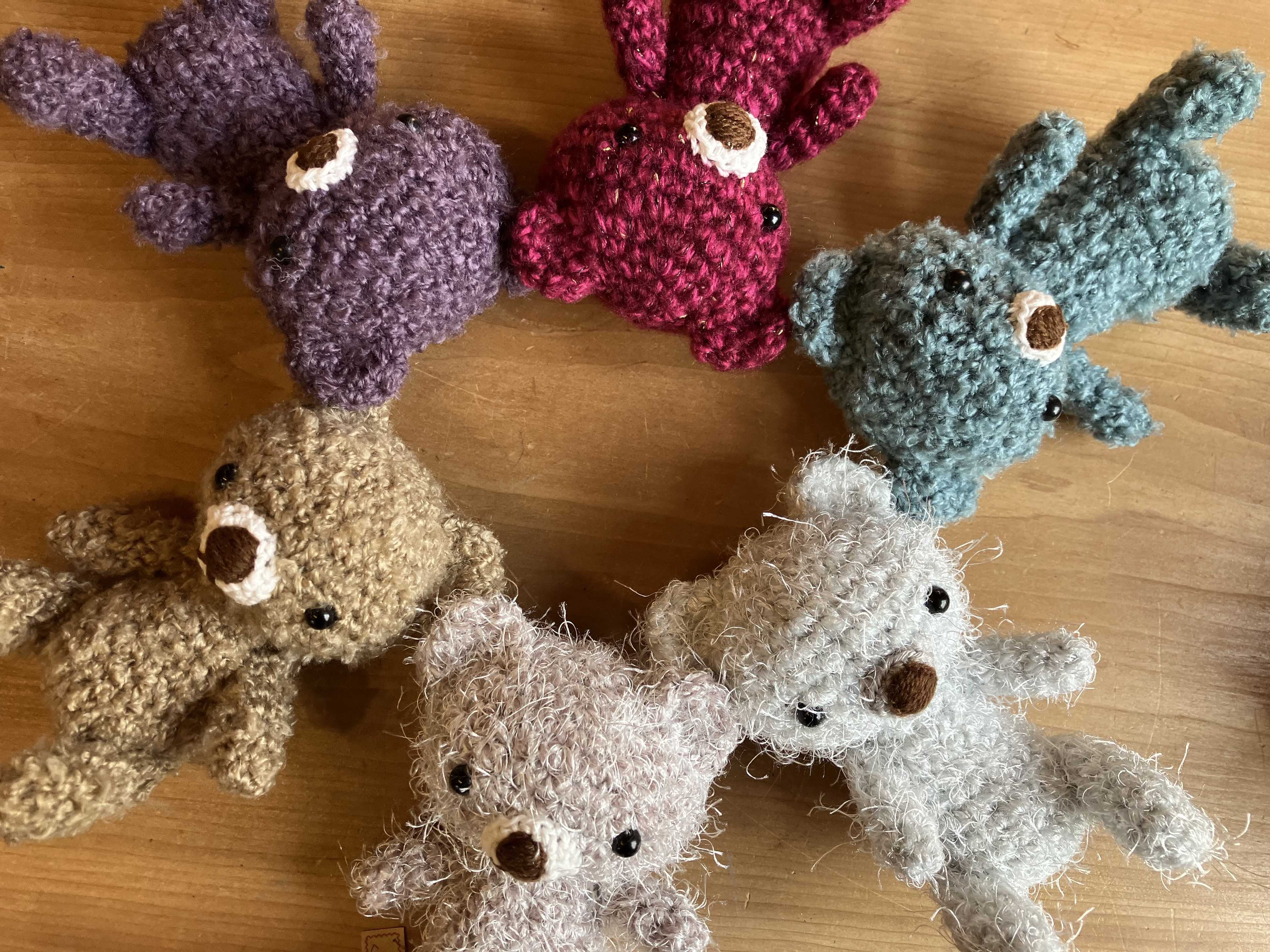 くまの編みぐるみ、6個出来上がり!綿の入れ具合が絶妙だったかにぎにぎしたくなる緩めのボディらしい笑なので、にぎにぎ感はそのままに新色4つ加えて全6種類ですサイズは座った状態で高さ13cm、5号針でかぎ針編みしました。若干編みづらいもふもふ毛糸で青、紫、ベージュを作り、毛長の毛糸でグレーと薄水色を。ピンクのはエンジとラメ入りピンクの二本どりで編んでますどの子も可愛くできました😆さて、次は何を作ろうかな☺️人気ブログランキング最後までご覧くださいましてありがとうございますポチっと応援お願いします🤲