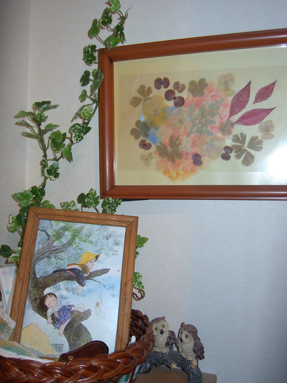 中島潔の絵と押し花 玄関のモネの絵 家の壁のいたるところに小さな絵を飾っています。 本当は本物の絵やせめてリトグラフを飾るといいのでしょうけど 買えないので絵葉書大の絵をたくさん飾っています。 美術館がすぐ近くなので よく娘と出かけます。 見たい絵が展示してある時は二人で見ますが そうでないときは ギャラリーのような売店で結構楽しめます。 玄関にちょこっと置いてあるのですが うちには これで丁度いい!と満足しています。 中島潔さんの描くこどもの絵が大好きです。 モネの美しく明るい色彩が大好きです。