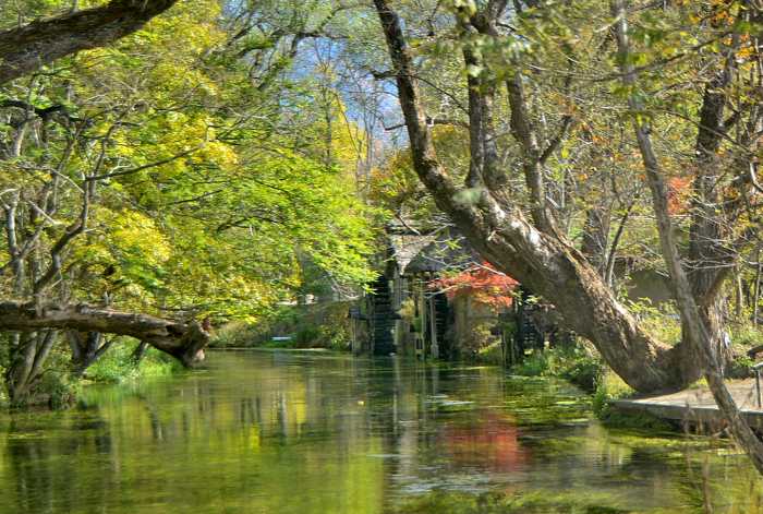 大王わさび農場にて農場内を流れる蓼川の水車小屋紅葉が見ごろですそしてゆっくりと回る…