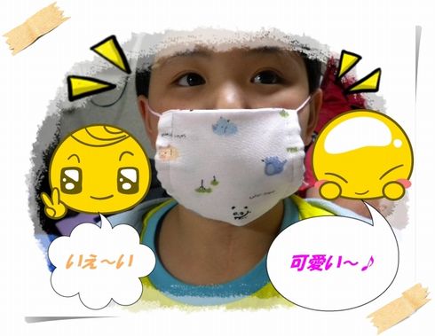 すーのマスク姿子供用じゃ小さかったので、大人サイズに変更。マスク用のゴム買わなくっちゃ