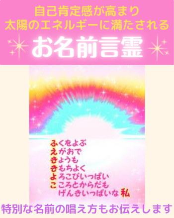 初めてご覧になる方は→こちらをご覧ください先月のことになりますが、新春特別企画第2弾で、ご自分とお孫さんのお誕生日プレゼントとして、お名前言霊をご注文いただきました☆今までもありましたが、同じ名字でのご注文が入ると、同じようになるとつまらないので、「いい言霊ができるかなあ・・・」と、注文が入った瞬間、実はちょっとドキッとしちゃうのです(^^;)今回は全てお任せのオーダーで作らせていただきましたが、それぞれの言霊が素晴らしいものができ、私も満足しています✨気に入っていただき、とても嬉しいご感想を頂きました☆お願いしていた自分と孫の「お名前言霊」受け取りました。全ておまかせでお願いした「お名前言霊」…特別な太陽の写真とメッセージは今の自分への言葉と受け取りました。素敵な言霊をありがとうございます。自分の言霊はイメージしやすく心あたたまるものでした。「やさしい~」とつぶやきながら暫く癒されてました。また、孫のお名前言霊は誕生日の贈り物としてお願いしました。自分とは対照的でエネルギー溢れる言霊で輝く未来を感じました。自分の名前を大切にしていって欲しいです。またパワー溢れる太陽のオーラに包まれ常に守って頂けるようでとてもありがたく感じました。これを機に太陽に興味を持ち感謝を向けられるようになって欲しいと願っています心を尽くして頂いたことがメールの応対でも伝わってきました。本当に最高のプレゼントです♪ 大切にします!ありがとうございました。(埼玉県 Yさま)嬉しいご感想をどうもありがとうございます✨そして、お友達にお名前言霊をご紹介され、ご注文を頂きました!こちらの方は、これからこうなりたいという望みをたくさん伺って、それをもとに作らせていただきました。こちらも満足する言霊ができて、とても喜んで頂き、嬉しいご感想を頂きました✨素敵なメッセージと写真をありがとうございました😊言霊、写真、名前、すべてが調和されて、わたしの心の中に染み入ります🩷見ていると胸の奥がじんわりとして、勇気が湧いてきます。「あぁー、わたしのやりたいことはこれなんだぁ〜」と涙が出ます。柔らかく優しいエネルギーを感じます。このエネルギーで過ごして行こうと思います。つくづく、お願いして良かったと感じております。本当に、本当にありがとうございます😊(山形県 Kさま)ご感想を送っていただきありがとうございます✨喜んで頂けて嬉しいです♪本当なら出来上がったお名前言霊をお見せしたいところですが、特別なオーダーメイドですので。そんな、特別なオーダーメイドで、それなりにエネルギーを使うので、大変恐縮ですが、4月から価格を変更することにいたしました。お名前言霊は過去のブログでいろいろ書いてます。https://plaza.rakuten.co.jp/arigatosun/diary/ctgylist/?ctgy=17気になった方は、今のうちにぜひご自分の言霊をいかがでしょうか😊ご注文はこちらから私も個人的にプレゼントで送りますが、男性も涙ぐむほど喜んでいただけます✨お名前の入ったプレゼントは本当に喜ばれますので、大切な方へのプレゼントにぜひ☆高山神社とコラボで作った写真を販売しています✨同じ記事をもう一つのブログでも書いています https://ameblo.jp/fuekiyo/ご覧いただきありがとうございます。お問い合わせやご感想などはこちらからお願いします。※コメント欄は閉じていますLINEスタンプ発売中です!お相手に癒しや元気のエネルギーを届けるような言葉のスタンプたちです。毎週日曜日にメルマガ配信しています。太陽からのメッセージをお届しています。読者の方にはお誕生日プレゼントで無料ミニリーディングもしています。こちらからご登録ください。http://www.mag2.com/m/M0096049.html病院や福祉施設等に写真をプレゼントします「癒し」2Lサイズをお届けいたします。全国へ発送いたします。働いている方からのご連絡をお待ちしております。ホームページポートフォリオサイトネットショップ癒しのアートとしてお部屋に飾っていただけたら嬉しいです。大切な方や病気の方へのプレゼント、新築祝い・開店祝いなどにも喜ばれていますメニューに載せてない写真はたくさんあります。ブログをご覧になって欲しい写真がありましたら、どのサイズでもお届けいたします。 ステッカーやハンカチもヒーリングアイテムとして好評です♪ネットショッピングのご利用が難しい方は、メールでもご注文を承っています。リーディングしています☆太陽の写真を使って、魂の本質や今世のテーマ、癒すべき問題・ブロック、過去、現在、未来等のメッセージをお届けいたします。オンラインで無料リーディングできます☆携帯からアクセスしている方は、こちらもご覧ください。Facebook(友達申請の際はメッセージもお願いいたします)Instagram