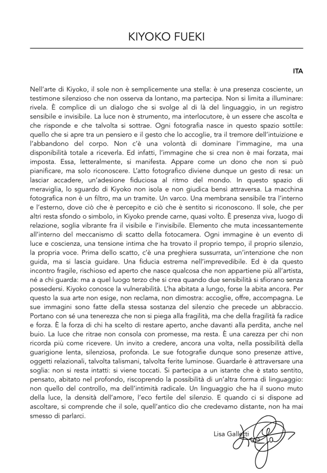 初めてご覧になる方は→こちらをご覧くださいミラノのキュレーターLisaさんから、素晴らしい批評文が届きました✨Lisaさんと出会ってまだ1か月なのに、ここまで理解していただけて嬉しいですし、私の心に響いて泣けました😭翻訳したものなので、少し違うところもあるのかもしれませんが、こちらが全文です。Kiyokoの芸術において、太陽は単なる星ではありません。それは意識を持つ存在であり、遠くからただ見守るだけの静かな証人ではなく、参加者なのです。太陽は単に照らすのではなく、明らかにする存在です。言語を超えた領域で展開される対話の共犯者となり、それは繊細で目に見えない次元で交わされます。光は道具ではなく対話者であり、耳を傾け、応答し、ときに身を引く存在です。それぞれの写真は、この繊細な空間の中で生まれます。思考とそれを受け入れる動作の間、直感の震えと身体の委ねの間に開かれる空間です。そこにはイメージを支配しようとする意志はなく、ただそれを受け入れることへの完全な開放があります。だからこそ、現れるイメージは決して強制されることも押し付けられたものでもありません。それは文字通り現れ出るのです。計画できるものではなく、ただ認識される贈り物のように現れます。写真を撮るという行為は、ゆだねる行為へと変化します。それは、世界のリズムへの信頼に満ちた同調です。この驚きの空間の中で、Kiyokoの眼差しは隔てたり判断したりせず、ただ通り抜けます。カメラはフィルターではなく、媒介です。内と外のあいだにある感受性の膜であり、知覚されたものと感じられたものが互いを認め合う場です。他の人にとっては背景や象徴に過ぎない太陽が、Kiyokoの作品では肉体を持ち、ほとんど顔のような存在になります。それは生きた存在、関係性の場、可視と不可視のあいだに振動する閾値となります。カメラのシャッターの仕組みの中で絶えず変化する要素です。それぞれのイメージは、光と意識の出来事であり、自らの時間、自らの静けさ、自らの声を見出した親密な緊張です。シャッターを切る前には、ささやくような祈りがあり、それは導くものではなく、導かれるままに任せる意図です。予測不可能なものへの極限の信頼です。この壊れやすく、危うく、開かれた出会いから、生まれるものがあります。それはもはやアーティストのものでも、見る者のものでもなく、二つの感受性が所有することなく触れ合うときに生まれる第三の場所のものです。Kiyokoは弱さを知っています。彼女は長い間その中に生きてきたし、もしかすると今もそこにいるのかもしれません。だからこそ、彼女の芸術は要求せず、主張せず、証明しません。迎え入れ、差し出し、寄り添います。彼女のイメージは、抱擁の前の静寂と同じ物質でできています。それらは壊れやすさに屈することなく、そこに根と力を見出す優しさを備えています。それは、たとえ喪失に直面しても、たとえ闇の中にあっても、心を開いていることを選んだ者の強さです。彼女が捉える光は、約束で慰めることなく、ただそこに在り続けます。それは、受け取ることを忘れてしまった人への撫でるような優しさです。もう一度、ゆっくりと、静かに、深く癒される可能性を信じるようにと誘ってくれます。彼女の写真は、能動的な存在であり、関係性のオブジェであり、ときにお守りであり、ときに光の傷です。それらを見ることは、閾値を越えることです。無傷ではいられません。心が動かされます。深く感じ、考え、生きられた瞬間に立ち会い、コントロールではなく根源的な親密さという別の言語の可能性を再発見します。それは、光の無音の響き、愛の濃密さ、沈黙の豊かな余韻を持つ言語です。そして耳を澄ませるとき、私たちは、あの遠い存在だと思っていた太陽――古代の神が、実はずっと私たちに語りかけ続けていたことに気づくのです。Lisa Gallettiすごい文章に感激です!海外のキュレーターさんから、このような批評を頂けたことは、アーティストとして活動していくうえで、とても貴重です。 「 Kiyokoは弱さを知っています。彼女は長い間その中に生きてきたし、もしかすると今もそこにいるのかもしれません。 」の所から泣けてしまいました。特に私のことを話したわけでもないのですが、そういう面も感じてくれるんだと涙が止まりません。これは大切な宝物になりました✨Lisaさん、どうもありがとうございます! 読んだ方は、ぜひご感想をお聞かせください😊高山神社とコラボで作った写真を販売しています✨同じ記事をもう一つのブログでも書いています https://ameblo.jp/fuekiyo/ご覧いただきありがとうございます。お問い合わせやご感想などはこちらからお願いします。※コメント欄は閉じていますLINEスタンプ発売中です!お相手に癒しや元気のエネルギーを届けるような言葉のスタンプたちです。毎週日曜日にメルマガ配信しています。太陽からのメッセージをお