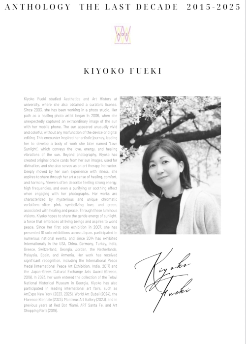 初めてご覧になる方は→こちらをご覧くださいイタリア・ミラノの M.A.D.S.アートギャラリー が10周年を記念して制作したアートブック『ANTHOLOGY』に、掲載していただきました✨私がM.A.D.S.アートギャラリーと関わり始めたのは今年5月からですが、ギャラリーが10年間で関わった重要なアーティストを紹介するというプロジェクトに、私にも参加して欲しいとお声がけいただき、とても嬉しかったです😆ページをめくると、世界中のアーティストの素晴らしい作品がたくさん並び、その中に私も1人のアーティストとして掲載されたこと、とても光栄で感謝の気持ちでいっぱいです✨多くのアーティストの中から、私を見つけてくれて、私の思いや写真について理解してくださり、素晴らしい批評文を書いてくださったキュレーターのLisaさんには心から感謝しています✨️今回の『ANTHOLOGY』には、代表作の「平和」「W神様」と、「Happiness」と「Well-being」を掲載していただきました。日本語では「Happiness」と「Well-being」はともに「幸福」と訳されますが、深い意味の違いを太陽のオーラで表現しています。この『ANTHOLOGY』は国際的ネットワーク(ギャラリー、キュレーター、コレクター、専門家など)を通じて配信されるとのことで、またさらに海外の方々にご覧いただける機会ができて嬉しいです✨ たまたま携帯で太陽を撮ったら不思議な写真が撮れて・・・そこから始まった私の道が、まさか世界各国のギャラリーと関わるアーティストになるとは夢にも思っていませんでした。初期の頃に、神人さんをはじめいろんな霊能者の方から、「太陽の真実が表れているこの写真を、日本から世界へ、多くの方々に見せることが役目」と言われたことをずっと心に刻み、地道に19年も続けてきました。海外の方とのやり取りは英語で大変ですし、高額な出展料をドルやユーロで海外に送金するのも、はじめは本当に勇気がいってチャレンジでした。ありがたいことに、今ではいろいろな国のギャラリーから連絡がくるようになり、本当にチャレンジした甲斐がありました✊昨日も新たにフランスのギャラリーからご連絡をいただきました。これからも、太陽のカラフルな光の美しさや癒やしのエネルギーなどを届けていきたいと思います✨<掲載文>Kiyoko Fueki studied Aesthetics and Art History at university, where she also obtained a curator’s license.Since 2003, she has been working in a photo studio. Her path as a healing photo artist began in 2006, when she unexpectedly captured an extraordinary image of the sun with her mobile phone. The sun appearedunusually vivid and colorful, without any malfunction of the device or digital editing.This encounter inspired her artistic journey, leading her to develop a body of work she later named “Love Sunlight”, which conveys the love, energy, and healing vibrations of the sun. Beyond photography, Kiyoko has created original oracle cards from her sun images, used for divination, and she also serves as an art therapy instructor.Deeply moved by her own experience with illness, she aspires to share through her art a sense of healing, comfort, and harmony. Viewers often describe feeling strong energy,high frequencies, and even a purifying or soothing effect when engaging with her photographs. Her works are characterized by mysterious and unique chromatic variations—often pink, symbolizing love, and green, associated with healing and peace. Through these luminous visions, Kiyoko hopes to share the gentle energy of sunlight, a force that embraces all living beings and aspires to world peace. Since her first solo exhibition in 2007, she has presented 10 solo exhibitions across Japan, participated in numerous national events, and since 2014 has exhibited internationally in the USA, China, Germany, Turkey, India, Greece, Switzerland, Georgia, Jordan, the Netherlands, Malaysia, Spain, and Armenia. Her work has received significant recognition, including the International Peace Medal (International Peace Art Exhibition, India, 2017) and the Japan–Greek Cultural Exchange Arts Award (Greece, 2019). In 2023, her work entered the collection of the Telavi National Historical Museum in Georgia. Kiyoko has also participated in leading international art fairs, such as ArtExpo New York (2023, 2025), World Art Dubai (2024), the Florence Biennale (2023), Montreux Art Gallery (2023), and in previous years at Red Dot Miami, ART Santa Fe, and Art Shopping Paris (2019).A B O U T H E R W O R KIn Kiyoko Fueki’s art, light is not a simple natural phenomenon, but a living presence capable of establishing an intimate dialogue with the observer.Her photographs do not merely capture the image of the sun: they reveal a consciousness, a breath that manifests itself as vital energy. Within them, there is no technical dominance, no artifice: there is an act of surrender, a willingness to be traversed by mystery, a radical trust in the unpredictable. Each image appears as a gift, as an unexpected revelation that no longer belongs solely to the artist, but at the same time to the sun, to the world, and to the viewer. It is in this fragile intersection that her work is born: in the space where intuition encounters matter, and matter becomes luminous vibration. Kiyoko’s gaze does not isolate and does not judge: it welcomes. Photography is not a filter, but a threshold; not distance, but radical closeness. Light, which for others remains a simple symbol, becomes in her art an entity that listens, that responds, that pr