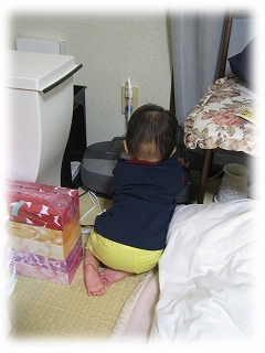 第三水曜日は隣町にあるアート&クラフトDUOで子連れOKスクラップブッキング講座が開講されています。今日は息子を連れて見学に行く予定にしていたけれど、朝から雨しかも全然起きてくれないし。見学はまた来月に延期。雨の中、外にでるのも億劫なので、息子と家の中で過ごしました。なんだか部屋の隅っこでゴソゴソしてます。狭いところに、ちょこんと可愛く正座してますパパ所有のCDラジカセが面白いみたいで、おとなしく遊んでます。