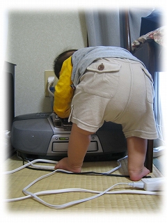 昨日遊んだCDラジカセが余程気に入ったらしい。今日も朝起きたら速攻ラジカセの前へハイハイで移動一心不乱に遊んでます。CDが鳴ったり、止まったりラジオがついたり、電源が切れたり・・・ラジカセ壊れそう?大丈夫??ふと気づいたら、こんな体勢になって遊んでます。これって つかまり立ち??