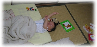 10ヶ月すぎても、ずるずる後退か、方向移動しかできない息子だったけれど今日ママの実家のフローリングの上を、2~3歩前進した??様子。のっそのっそと象並みの鈍さだったけど・・・連休あけなのでパパの帰りが遅いだろうと思って、息子と二人きりの風呂に挑戦。以前、浮き輪に挑戦したけど、大泣きして風呂の水をがぶ飲みしかけて大変だったので、浮き輪は撤収。今日はママが身体洗ってる間は、息子も洗い場に座っててもらう作戦です。しかし、まあ、泣いたパパの実家でいただいた風呂用おもちゃを置いてから、息子を座らせたけど、床にお尻が触れたとたん、ギャン泣き・・・ママの太股にしがみついて泣いてました。洗い終わって抱っこするまでエンドレスで風呂場だから鳴き声が響きまくり。ああ・・虐待してる気分。でも、ママと二人で入るときは、抱っこできないときがあるのは仕方ないし。さんざんな風呂から上がって、身体をふいてたら、パパが帰ってきました。もう少し待ってればよかったよっぽど風呂が辛かったのか、パパが食事してる間中、パパの手を握りしめる息子ママは鬼さ、ちえっ!風呂でワンワン泣いたおかげか?「ねんねよ~」と布団につれていくと、しばらく布団の上を右往左往していたけれど、そのうち、ママの手の平に頬を乗せた状態で突っ伏して寝ちゃいました。おっぱい飲まずに寝るなんて・・・こんなときもあるんだね。