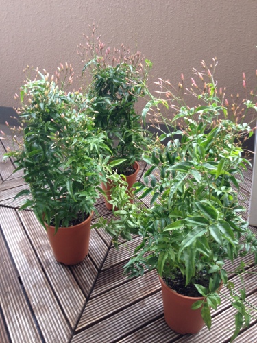 今日の土曜日はひさびさのまったりゆっくり週末。というかまったりしている余裕もないのだけれど・・・・実は、仕事を辞めることにしました。リラクゼーションサロンの仕事。あと数回行けば終わり。で、ぷー子するわけにはいかなくていろいろ仕事を探してやっと近所の耳鼻科の受付兼診療補助の仕事に就いたのだけれど、これが忙しくて忙しくて・・・研修中は毎日出勤で、ほんとに休みなく診療日は毎日勤務でびっくりでした。新しい仕事は新鮮だったけれど、(医療費のこととかちょっと分かったし)なによりスピードがすごく求められることにもびっくりで、勤務一週間で辞めることに・・・・・はあ~我ながら情けないという気持ちと、あれは無理という気持ちと、この年齢でこの先どうするか、サロンワークは好きだけれど、、、、求人サイトをにらみながら悩みつつ、お店をちょっと見に行ってみたり悩み疲れ状態。悩んでても進まないんだけれど、せっかく時間が出来たし、今日は夏の石鹸を作ってました。オリーブオイル・ココナッツオイル・パームオイル・カスターオイル白とオレンジのレイヤーです。白は生地そのまま。オレンジはターメリックパウダーを加えたもの。大さじ2くらいを生地に溶いてくわえたらすごく赤色→オレンジになりました。黄色くらいを想像してたのだけれど・・・量が多かったかも;;ターメリックは日焼けしたお肌のケアに良いらしいので、ま、いいか。タオルに色着きそうだけど。香りは、ティートリー・レモングラス・クラリセージ・サンダルウッド。型出しが楽しみです。こないだブログでも紹介しました羽衣ジャスミンが咲きました!今は毎日小さな白い花をたくさん咲かせてくれてます。いい匂い~。