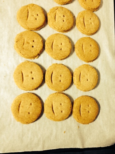 お菓子が好きで、とくにポテトチップ。疲れた体に塩気がたまらなくおいしい~ポテトに限らず、「3日分」と思って大袋のお菓子を買っても1日で食べてしまうこともあるから、ならば作ろう! と。本を買いました。この本、アマ●ンさんでみなさんのコメントがすごくよくって気になっていた本。まずは市の図書館で借りてみたんですけれど(順番もけっこう待ったよ)いい感じのレシピがたくさん載っていたので、結局買いました少ない決まった材料でささっと作れるのがいいです。材料の計量からオーブンに入れるまで10分。焼きは少し長めで30分。バターも卵も使わないので、加えた素材をそのまま素朴に味わえるお菓子ができます。表紙のスマイルビスケット。 自作はスマイルじゃないなぁ(笑) 顔が怖い・・けど、メープルが効いてます!ジンジャーハニービスケット。 けっこう生姜が効いてる! ブタさんと花の形♪ローズマリーとじゃがいものクラッカー。 塩気のものもいいね!にんじんスティック。 ほんのりにんじん。いい甘さ~♪野菜使ったものもありますけれど、著者さんは、「お菓子で野菜の栄養をとるという考え方は、ちょっぴり苦手」とのこと。「素材のひとつとして野菜を使ったら、おいしかった! そんな気楽な野菜のお菓子が作りたいな、と思っています」とおっしゃっています。このコトバにけっこう感動、共感したmatuでした。
