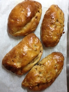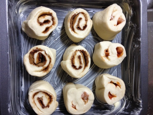 例のパン型で、シナモンロールを作りたくなって、でも全部シナモンじゃ食べるのたいへんだから、4つはウインナーにしました。ウインナーは埋もれてしまったけれど~シナモンの渦がかわいい発酵前・・・・焼き上がり!