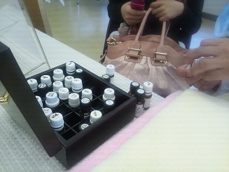 先日出展致しました、イベントのご報告です。 当店は、「アロマ心理リーディング&ハンドマッサージ」で出展♪ ご縁のある方に体験いただいたことに感謝です☆ そして、香りが本当に、心模様を映し出している、ということを確信いたしました。 精油の持つ、実際の効能&作用、そして、古来からのエピソードや、その香りから受けるインスピレーションetc.から選ばれた香り(好きな香り、嫌いな香り)をリーディング(読み取って)していくのですが、これが本当に、面白いほど当たります☆(占いではないんですけどね) 好きな香りは、今フォーカスしていることや現在の心模様、嫌いな香りは、 苦手意識や課題、フタをしていること、などが現れています。 色彩心理があるように香りの心理もあるのです♪皆様、すごい!と感心していらっしゃいました☆ こちらのメニューは、サロンでも体験できます。 興味のある方は、ご連絡くださいね。 ●色と香り、ヒーリングのサンクチュアリ 香りの創造空間アロマヴェール http://www.h5.dion.ne.jp/~aroma.vl