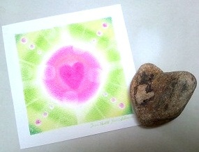 画像は、娘とワンコの散歩中に河原で見つけた、「ハートの中のハートの石」です。 珍しいでしょ? ハート型の形の石で、中に小さなハートの模様があるの♪ 「石との出会いはご縁」と言いますから、きっとうちのコになるご縁で出会ったんでしょうね☆ パステルの絵は、「パステルアート体験講座」で生徒さんと描いた絵です。 ちょうど、自分が、ショックなことがあって傷ついていた時で、 なぜか、「ウォーターメロントルマリン(外側がグリーンで真ん中がピンク色のクリスタルです)」がイメージで浮かんできて、 直感の左手だけを使って描きました。 「ウォーターメロントルマリン」は、ハートチャクラと共鳴する石で、 心身の癒し、愛情の癒しに関係する石です。 せっかくなので、「ハートの中のハートの石」とパチリ。 この石は、きちんと浄化後、 ご来店頂いた方に、願かけしていただき、 叶ったら、ご報告をいただく、ということで、当店の名物として、 頑張ってもらおうと思います♪ 恋愛、婚活のご相談も良くお受けしますので、「恋愛成就の石」として、デビューしても良いかもです♪石ちゃん、頑張ってよ~~~♪期待してるからねっ!!せっかくご縁があった石ですから、 大切にしようと思います。 ●色と香り、ヒーリングのサンクチュアリ 香りの創造空間アロマヴェール http://www.h5.dion.ne.jp/~aroma.vl