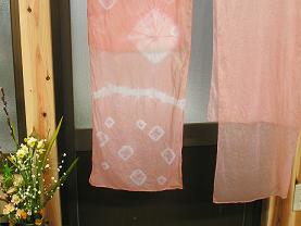 子供と協力し合って??、写真のような自然なサーモンピンクにビーズやビー玉で作った絞り模様の 春らしいスカーフ