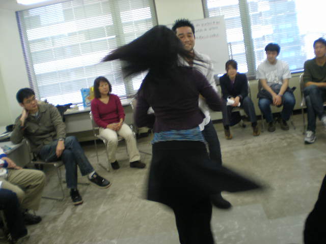遅くなりまして、すいません!前回 自由会話クラスに出席された 皆さま~お待たせいたしましたっ サルサパフォーマンスの写真UPしますよー今回から 数回、 自由会話クラスの先生をやってくれる チャーリー先生 &特別ゲストの サルサインストラクターの スナオさん、 &日常会話クラスでおなじみの ホルヘ先生 による、熱気ムンムン ラテンアメリカに吹く風を感じるような HOTなパフォーマンス でした。 とりあえず、 カメラマンをやってました ワタクシ、ヨウコは 必死でした。 ・・・ あー クルクル回るー 全てが 流れ星のようになるうぅぅぅぅぁぁぁぁー ワタシの お遊びデジカメでは 追いつかない・・・ ・・・なので、 お気に召した写真 OR ご自身が写っている写真 がありましたら、保存しておいてくださいね。 ↓↓↓こちらに フォトアルバムがあります↓↓↓http://photo.space.rakuten.co.jp/YjRmZWVmYzI3N2U2OGE_/album/15351/何枚か、こちらでも ご紹介しますねっ 突然踊らされたホルヘ先生 でも、流石!バッチリでしたネチャーリー先生の ボンゴの演奏も ・・・あの音 あの振動! 本当に素敵でした。 次回も チャーリー先生の パフォーマンス 有 楽しみーデスネ。次回の 自由会話クラスは 5月11日 日曜日 14時05分スタートです。今度からは 構文演習コーナー【Estudiamos】が無くなって、パフォーマンス & 先生との質疑応答 & おなじみの自由会話の、3本立て になります。 (← なんか、サザエさんの予告みたいになってしまった)おたのしみにー! でわ、また!