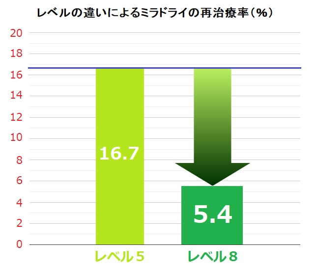 レベル8ミラドライの強みは?レベル8はマイクロ波の連続照射時間が最も長くなります。ミラドライはマイクロ波を使用した電子レンジと同じような仕組みです。電子レンジが時間を長くするほど食物を熱く熱するように、照射時間が長いほうが治療部位の温度を上げて高い効果を発揮します。この照射時間ですが連続というところが重要なポイントです。このことで高い温度の山を造ることができます。一方、レベル5のダブル照射のように、時間をおいての断続照射ではレベル5の効果まで上がったところで冷却し、時間をおいてまたレベル5で照射する。つまり、低い山が2つできるということで、最も治療に適した高温には達しないということです。これはダブルであろうとトリプルであろうと照射後に冷却し、間隔をあけてから照射するので効果は変わりません。ダブル照射での主な効果としてはハンドピースのずれによる照射漏れを防ぐことにあります。レベル8ミラドライの強みは連続照射で高温に導くことです。これはレベル5ダブル照射とレベル8シングル照射の再治療の比較です。レベル5ダブル照射では18%近くの方が再治療を受けていますが、レベル8シングル照射では5.4%と大幅に再治療率が改善しています。秋葉原フロンティアクリニック