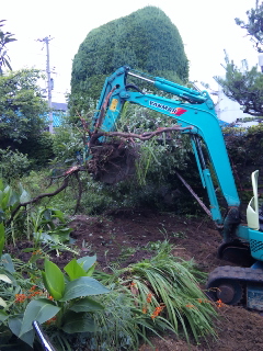 お庭が広いお家でガレージの工事をする現場です。植栽がかなり多いので重機でまず撤去するところです。整地してから土間を打ってカーポート・跳ね上げ門扉を取付る予定です。これからは二台置けますから、使い勝手良くなったと言って頂けるように工事をさせて頂きます。