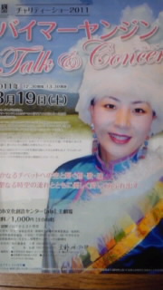 ぎふ笑いヨガのまほちゃんと国際ソロプチミスト【バイマーヤンジン】さんチャリティーコンサートへ言ってきました可児市のアーラに来ると何だか知人にいっぱい出会えてふるさとのような安堵感たくさんの知人に久しぶりに逢えて嬉しかったです。何か。。。再会というと大げさですが。。。【今日こうしてこの時に、またあなたに出会えた】それだけで、ハグしたいほど。。嬉しい。。泣きたいほど。。愛おしい。。黙祷から始まったコンサート。今回の売り上げは全て東日本大震災の義援金に。。日本に来て16年のバイマーヤンジンさん。名前のバイマーヤンジンとはチベット語で【ハスの花にのった音楽の神様】という意味。。(ん?どこかで聞いたことあるような?サラスヴァティ?弁財天?のことなのかなあ?)大阪弁混じりの日本語はとてもお上手。愛とユーモアがたっぷりで・・・チベットの文化のお話し、チベットの民謡や日本の民謡を歌ってくれました。(2003年に徹子の部屋に出演したバイマーヤンジンさん チベットへ学校建設を)いっぱい泣いて。。いっぱい笑ってきましたこんな時に・・と罪悪感を感じてしまうあなた。。そんなあなたは、心の優しいひと人は【取り入れ】→【吸収し】→【排泄する】の 生体サイクルです。もしも、便や尿を排泄せずに、体に溜め込んでしまったらどうなりますか?体が悲鳴を上げてしまいます。新たな食物を取り込めなくなってしまいます。そういった、体のサイクルに逆らわず、心もちゃんと。。のせてあげましょうね。心と体は一心同体皆さんも【泣くことで不安を放出】させてください。【笑うことで悲しみを放出】してください。そして、【新鮮な思い】をいっぱい体に取り入れてください。体をほぐし・・心をほぐし・・自分を愛しみ。。。まず、あなたが元気でいることです。1日でもお役に立てる日が来るときを祈りながら、心も体も整えて待ちましょう。