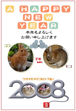 2008年あけましておめでとうございます(^-^)/ (¨ )相変わらずやな (・_・)......ン?なに年ヤロ~?の ココモコメインの マイ年賀状~ (^-^)v昨年末はいろいろいろいろ 十重二十重に重なりヽ(^。^)ノアレアレーブログ更新をままならなくした一番の原因はパソコン部屋の工事!畳からフローリングに変えるとき 床下に塗ったお薬が(∋_∈)クチャイ長い時間 PCに向かっていられなくて・・・気持ち悪くなるのですソウカ(・o・)!こういうとき ノート型だったらいいのねえ26日から二日間で済んだのに ニオイはまだ とれません 工事中 ココモコは リビングから 出さなかったのですが途中モコが ドアをすり抜けて工事しているところに入り込み「オレらの遊び場所はどうなるんデシュカ~」って必死で走り回り・・その翌日 呼吸が変になり(T.T )( T.T)オロオロうさぎさんてウレシイと ブウブウ フンフン 鼻を鳴らしますよねそのブウブウが 呼吸する度に 大きなブウ~ ブヒ~ という途中に何か引っ掛かったみたいな音がでるんです 即 病院へ電話したら「元気なら 様子見てください」って様子は いつもと変わらず 歯を削ってからは●もおっきいしよく食べるし (’’;)ウーン ウッカリできないねえ~翌日には 元に戻って ホッとしたのでした~人が気持ち悪くなるニオイを 小さい身体で嗅いだらダメですケージの近くに イオンで空気清浄するという器具を置きましたニオイが完全になくなるまでは 廊下ダッシュもできませんそして明日 かあちゃんが1年分の主婦をする日だ(^o^)/とおちゃんの兄弟姉妹 そして甥や姪が 一堂に集まりますうちのとおちゃんには 兄 姉2人 弟 妹 が全部おります6人並ぶと 笑っちゃうくらい 血のつながりを 感じますここで がんばっておくと (^^)vあとが楽なのだ(^○^)さあて これから 準備にかかります 落ち着きましたら みなさんのところに ご挨拶に伺いますね~ では!本年もどうぞ よろしくお願いいたします m(__)m