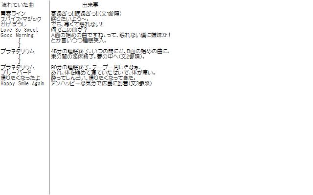 昨日、祖父の13回忌で広島に行ってきました。その、行きの道中でのことをまとめた表です。 文1…朝5時起きで、ものすごく眠たかったんです。しかも、早朝だからめっちゃ寒い。暖房付けてもなかなか暖まらず。 文2…夢を見ました。 真っ暗な夜の駐車場で、Louiseさんとバスを待っていました。何でだろうね? そして、一つ乗り遅れました…駄目じゃねぇか、僕。時間厳守で行かなきゃね。 でも、もう一つ来ました。乗れました。終わりです。オチは? で、目覚めたら車の中にいました。当然だね。 でも、声が出ません!!必死に父にそれを伝えようとするが、声が出ない!!助けて!! それも夢でした…。 文3…その後、お経を聞き、高級な昼食を食べました。生まれたこの方初めて、キャビアなど食べさせてもらいましたよ!!あんまりキャビアはおいしいとは言えなかったけど…。 夕食はすき焼き!!おいしかった~!!食べてばっかりだな…。 今日の年表形式面白かったですか?あっ、面白くなかった。僕も、そう思う。 まぁ、ペイント使っての日記のテストだと思って下さい。 将来へ繋げ!!