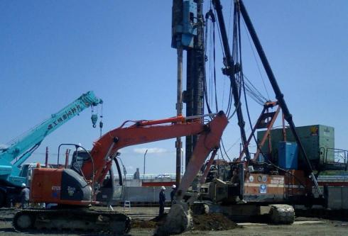 本日より杭工事が始まりました。杭の大きさはΦ800と径はあるのですが、長さが5mと6m・・・み、短い。見た目はズンドウタイプです。で、一本目を掘りはじめたのが確か9:30頃で杭を打ち終わったのが、昼を挟んで14:00ちょい前でした。岩盤が思ったより硬くて・・・><杭の高止まりも出来ない工法なんでなんとしてでも既定の深さまで入れなきゃいけないのが大変です。さすがに気合で現場は進まないですw