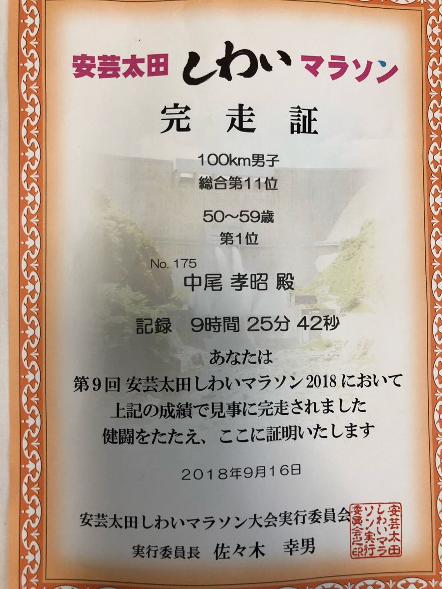 しわいマラソンこれまでに出た℃の大会よりも、下り坂がきつい上りはペースを落とせばどうにかクリアできても下りのダメージは、大腿四頭筋にもろに出るこれまでにマラソンの距離に対する対策はしてきたのでそれなりに自信はあったそれでも、前半をセーブしながらペースは感覚で押さえながら人と並走になっても、エイドでトイレに行ったり給水で離れるようにして極力一人走りを心がけたそれでも、前半戦を一緒したマラソン2時間30分台の子との走りで予想以上のラップをたった10秒くらいだがキロ4分台を刻んではいけなかった下りも、4分30秒にならないようにスムーズに降りたはずだが初の100kmは苦い経験となりそして、弱点が見つかりマラソンに活かす部分が見えた自分の弱いところが限界を超えたときそこを起点としていろいろな部分に影響を及ぼすそれは、かばったり、無理したり、片ちんばになったり今回は、ガーミンでの測定をして腰に付けるバランスや接地他データが取れた長く走るとその弱い部分からバランスが崩れて走れなくなることが多い皆さんも、データが取れるならやってみるとよいまた、コースがコースで、標高獲得差が4000m弱ということを除いても100kmのマラソンでいう30kmの感じは70kmくらいにやってくるそこから90kmまでを乗り切れば、脚を残せればラストも走れる私は、脚が終わった70km以降無理せず、完走に切り替え、走りを歩幅も狭め、ペースもキロ7分切ればいい栗の気持ちで流した。まあ、流したというほど、楽ではないがそのおかげで、ゆかに追いつかれた85kmからの下り、88kmまでをさらに慎重に走ってキロ7分残り8kmを頑張るように切り替えた。そこからは、10時間を切る為の走りを心がけ堤防までをとにかく走り切るように、9時間30分以内で堤防につくことを目標にそうすると、上りは意外にエネルギーさえあれば走れる感じでキロ6分から6分半くらいで堤防まで到着そこからは、ひたすら461段の階段を1km上るここを以外に6分36秒でクリア時計は9時間9時間18分台ラスト上りしかないが、9時間30分が切れそうなので、ラストペースアップキロ5分12秒、そしてラストは4分30秒ペースまで上げてゴール。9時間25分42秒フルの通過が3時間20分台50kmが4時間12分(後半5時間13分)82km~92kmの10kmが1時間25分ラスト8kmが49分88km参加者500人弱、全完走者286人100km参加者169人、完走者119人気温スタート時22度から50kmから28度、31度くらいまで上がるコース、最高地点956m、最低地点163m(標高差獲得3600mくらい)消費カロリー、3600kcALペース 平均5分39秒(エイド含む)エイドロスタイム(予想でトイレ3回、給食5回、給水25回)前半5分、後半7分で12分くらい今回、コースにトンネルが多くあり、ガーミンがうまく作動しなかったのは原因がわからないが走行距離で97.2kmしか出なかったまあ、ウルトラなんで目安がわかれば良しとした今後に参考になるかわかりませんがこのコースを走るなら、3か月前から60kmや70kmを経験し大腿四頭筋の強化に取り組んでエイドでのロスタイムを少なくするトイレの対策も少なくて済むように朝と昼の気温差が大きいので中間点からは別レースと考える今回も1位から6位の方は安定した走りで失速もすくない、入賞を狙うならエイドを含めてキロ5~岐路5分15秒で行けるようにするしかし、林道も長く、コースを把握することが大事で、50km手前の下り坂7kmからの棚田を下りるまでの走りが重要で、ここでの余裕がないと最後まで走り切れない。そのためには、前半の余裕度を残し、林道や下りの走りを考える必要がある。いずれにしても、マラソンとは別物でこれを何回もやると、長くは走れるが追い込んだ練習をおろそかにしてしまう可能性がある年に、一回楽しんで出るくらいが良いと感じた。また、走りは周りにいても良いが気にせず一人で走るくらいが良い、格下と走るならよいが同レベルやウルトラベテランなどと一緒すると後半痛い目にあるエイドやトイレ、人それぞれなんで一緒に走るといっても本当に順位を狙わず、楽しんで時間の中で走るのならよいと思う。しわいとは広島できついやしんどいの意味本当にしわいマラソンはその名の通りであった。