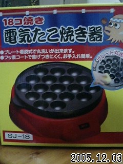 またやっちゃいました。いえね、ずっと前から欲しかったんだよ。でも、そんなの買ってどうする!って反対にあってたのねんで、今夜はお鍋で~あとちょっとで出来上がりってときにカセットコンロのガスが・・・ここまできて、メニューを変更するわけにもねぇ仕方なくでかけました。ねーちゃんも小僧もお供をしてくれないので一人寂しく行ったんだけどね帰り際、目が合っちゃったんだよね。天使と悪魔は、一応は戦ったんだけどねこんな場合の戦いは、悪魔が勝つに決まってる。で、買いました。え?何かって?これよ、これたこやき器まっとうなご家庭には必ずなくちゃ!必需品だよね。今までなかったのが、間違ってる。はぁ? いらないし、無い方が普通じゃんって、冷たいねーちゃんの言葉にもめげず。家に戻って「ほら、アンタたちが付いてこないからこんなの買っちゃったじゃん!アンタたちのせいだからね!」文句を言われる前にね。「で、いくらしたん?」いつにもまして冷たい声「700円」「だったらいいんじゃない?」よかったよ~ こんなときのねーちゃんは怖いんだもんね。ちゅうわけで明日のお昼はたこやきに決定!うまくできるかな?