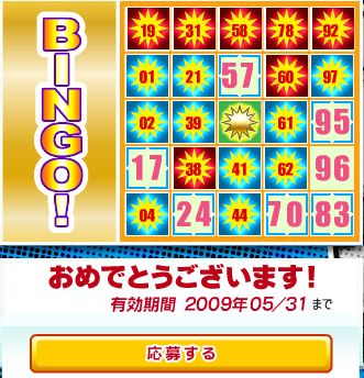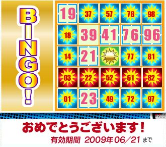 ++++++++++++++ はずれ++++++++++++++++++++++++++++今日ポイントGETするのはそこのアナタ毎日5,000名にポイントが当たる楽天ブログラッキーくじは下のバナーをクリック今日は全てハズレなり・・・ビンゴは端っこばかりに集中!四隅でビンゴは難しいな・・・今週も諦めの境地←大げさw