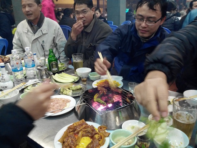 今日は毎年恒例、日本で行われる新年会にSkypeで参加する日。ただ、今は土日休みじゃないので、仕事終わってうちに帰ると日本時間で9時近くとかになる。なので、仕事中にちょっと抜けだしてとりあえず挨拶しといたんだけど、そのためには建物の外に出て、外でそれを行わなければなんない。。。。が、あいにくと今日は雨。しかも気温が10度ちょっとしか無くて、寒い。まぁ、とは言っても、それに耐えながらのご挨拶でしたよ。大体、飲み会にSkypeで参加すると、向こうがうるさくて、こっちがよっぽどデカい声でしゃべらないと向こうに聞こえない。デカい声でしゃべっても聞こえないこともある。なので、たいがい、会話でコミュニケーションすることはあきらめて、ジェスチャーか、チャット。今回もそんな感じで、雨の中、ご挨拶しといた。そんなこんなしてる内に、うちの子分から、「今日ベトナム人だけで飲みに行く予定なんだけど、来る?」と。最初は日本の方の新年会があるからと思って欠席にしたんだけど、考えてみたら、家に帰ってSkype出来る頃にはもう向こうも二次会だし、こっちもベトナムで飲み会してるとこから中継した方が面白いこと間違いないと思い、出席することにした。。。。しかし、どうせ壁のない、外とおんなじ気温のとこで飲むんだろうから、なにもこんな冷たい雨の日を選ばなくても良さ気なもんだけど。で、そしたら、今日はヤギ肉屋さんとのこと。なので、前からヤギ肉食べたいと言ってた同僚さんも誘って行くことになった。到着すると。。。うん、やっぱ吹きっさらし。しかし、人入ってんなぁ。満員だし、子供もいる団体さんもいて、さながら週末の日本のチェーン店居酒屋の座敷みたいな雰囲気。そんな中、まずはヤギ焼き肉。うん、普通にうまい。ヤギ肉食べながら、きっつい酒を飲む。当然だんだんと意識が朦朧としてくる。そんな中で次はヤギ鍋。大体ヤギ肉屋さんってこのパターンで、まず焼肉食べて、締め?で鍋。まぁ、全体にうまかったよ。また来てもいいね。でも今度は雨の降ってない時にwちなみに日本の新年会への参加は、ここからではうまく繋がらず、叶いませんでした。先に一度挨拶しといてよかったわ。ヤギ焼き肉風景。こんなです。柱の向こうは外とツーツーです。