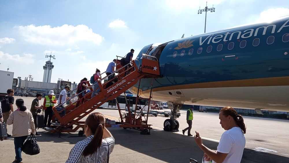 今週末の飛行機はいつものようにジェットスター。事前にウェブチェックインした座席番号は10B。自分はたいがい48時間前のウェブチェックイン開始から間もないくらいの時間帯、たいがい木曜の午前中に手続きするので、勝手に割り振られる座席は前の方になる。で、座席番号が10列だったことで、「もしや」と思ってた。すると案の定。。。案の定、ベトナム航空の機材だった。以前も一度あったので、「それかな?」と思ってたというわけです。ベトナム航空の機材にジェットスターのタラップが設置されてるシュールな図。機内に入ると、一番前にビジネス席が2列あって、その後ろの、エコノミーの最初の列が“10列目”。ここの真ん中の席。さすがにジェットスターのチケット買ったはずなのにベトナム航空の機材なので不安を覚える人もいて、隣りのベトナム人のおっちゃんに、「これ、ジェットスターだよな?」って訊かれた。「そうですよー」って答えといたけど。ベトナム航空機材なので足元広い♪但し、前の席がビジネスで2席しか無いので、自分の前にはポケットがない。昔の、100%日本人の自分だったら遠慮して両側にあるポケット使えないか、すんごい勇気を奮って隣の人に「ここ使わせてもらっていいですか?」って訊くところだろうけど、ベトナムだとほとんどの人がこの状況で両側のポケット使うことに躊躇しない。なので、自分もベトナム流に、特に何も言わずに、当然のようにポケットに物入れといた。但し、ポケットに物入れてから気付いたのは、ポケット使った窓側の席の人はベトナム人じゃなくて、西洋人の若い兄ちゃんだったけど(^_^;)