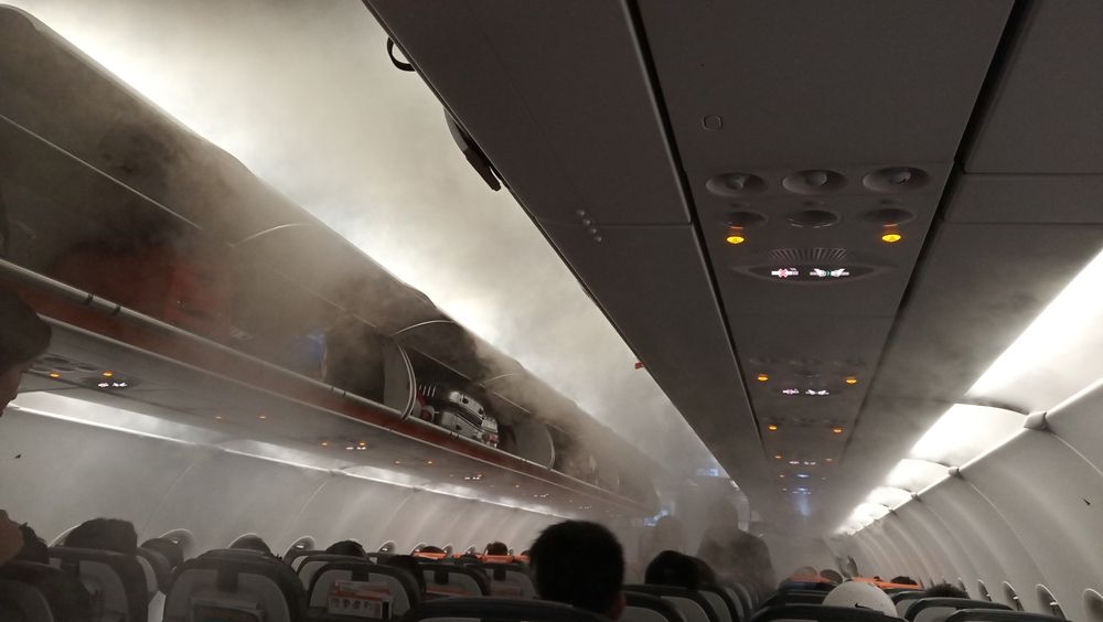 こちらの写真を見てください。えっ?飛行機で火事?と、思うほどの煙。。。ではなくて、水蒸気、靄でして、日本の飛行機ではあんまり見ない気がしますが、こちらは気温が高くて空気に水分を沢山含んでるからでしょうか?止まってた飛行機がエンジンをかけ始めて、室内の暑い空気を冷やし始める時によく出るといえば出ます。でも、先日のこれはちょっと今までに見たことのないすごさ。通路進んでく時に前の人も見えないし、棚の下に書いてある座席番号も近寄って見ないと見えない。ちょうど雨季が始まったとこで、気温は一年中で最高潮な頃。当然空気中に含むことの出来る水分量も一年で最高なわけで、そこに雨季が始まってほとんど目いっぱいまで水分を含んで、「気温40℃、湿度100%」くらいになってた空気に、飛行機の強力な冷房で冷やされた空気がぶつかって、空気中の水分が凝結して水蒸気(靄)になった、という、雲ができるのと同じような原理の現象だったわけです。まぁ、普段から、特に夜のフライトに乗った時にはよくこの水蒸気発生してるといえばしてます。夜のフライトの方が朝方より気温が高いからでしょうかね?普段は別になんとも感じないというか、もう慣れっこになってしまったのですが、クリスマスシーズンになると、飛行機もそれ用のBGMを流したりしますので、そこにこのスモーク的なのが出てくると、ちょっと雰囲気に合ってていい感じになったりはしますね。