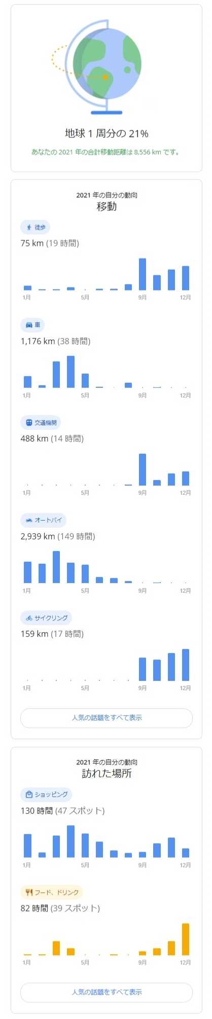 先日、ぐ~ぐるさんから「昨年のあなたのアクティビティです」みたいのが送られてきたのだけど、これが感慨深い。ちょっと縦になが~いやつ貼りますよ。前半のベトナムにいた時と、後半の日本に戻ってきてのこのコントラスト。前半の移動はほぼ車とオートバイ。特に、通勤に使ってたオートバイで、ほとんど最初の5ヶ月だけで3000km走ってます。月600km。3月に引っ越すまでは往復40kmで、その後は20kmになったのだけど、それほど違いが無いな。テトとかあったからかな。日本に戻って来て9月以降は徒歩と電車とチャリ。9月は徒歩と電車が多くて、チャリは月を経る毎に増えてる。9月は墓参り行ったりしたからかな?チャリはだんだんと近所出かけるのにも徒歩がかったるくなって、チャリにばっかしたから。そういえば、“交通機関”にベトナムから日本への飛行機の移動が含まれてないな。下に行って、ショッピングとフード。特にフードは、ハノイでコロナで社会隔離になった時期はほぼ皆無になってる。それに対してショッピングはそこそこ。スーパーとかに買い物には行ってたからな。と、まぁ、こんな感じで、昨年の場合は前半と後半(ハノイの社会隔離も含めれば3分割)で全然状況が違ったので、こんなにコントラストの大きな結果となりまして、感慨深いです。これは、保存版にしておこうと思います。