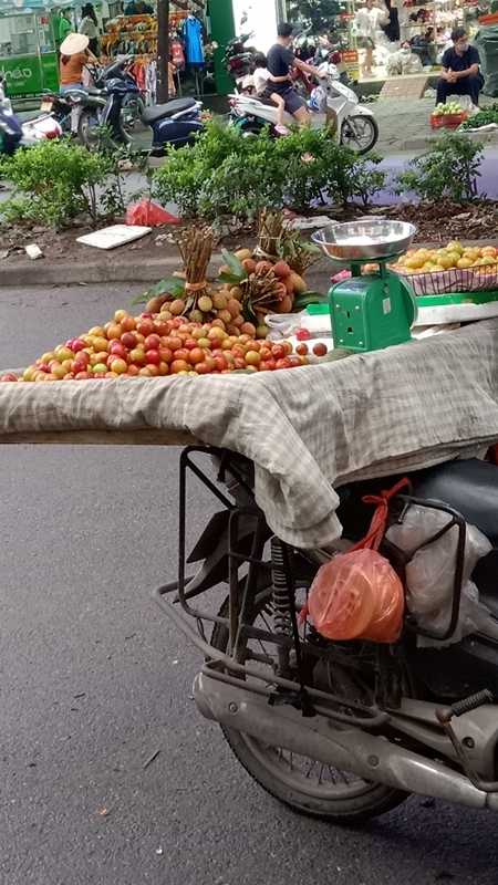 先日、いつものように近所をお散歩してたところ、バイクに積んだ果物売りさんが目に留まりまして、最初は下の写真の手前に写ってるスモモ的なやつがキレイだな、ウマそうだな、と目に留まったのですが、その後、台の上をよくみると、おぉ!あれは!幻のライチさんじゃあありませんか!手前のスモモの奥、枝が縛ってあるのがライチです。この日はまだ4月の末、私の認識ではライチが出回るのは5月の下旬からなので、相当早いです。まぁ、種類もあって今回のは早生品種なんでしょう。んで、まだ値段も高いだろうし味も?なので、今回は買いませんでしたが、出来れば日本に戻る前に一度食べたいものです。