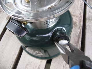 娘が部活から帰ってくる前に、先日調子の悪かったコールマンのガソリンランタンの様子を見ることにしました。どこの調子が悪いかと言うと、ポンピングしてもランタンの明るさが直ぐに暗くなってくるのです。そこで、ポンプ内部の状態を見てみることにしました。 あらかじめ、ポンプノブを左に10回転ほど回し、ポンプ内のチェックバルブからエアーシステムを外しておきます。次に、ポンプを外しますが、専用工具が無いのでラジオペンチの先でポンプキャップを左に10度ほど回し、ポンプキャップごと引き抜きました。 ポンプ部分を抜き出してみると..本体のポンプキャップ部分やポンプカップにも赤錆が着いています。潤滑油をこまめに差していなかったせいでしょう。しかし、これがランタンの明るさが直ぐに暗くなる原因とは考えにくいので、もう一度ポンプを本体に戻して実験してみました。 ランタンをポンピングし、圧を掛けてからポンプノブにライターの火を当てると..火がついてしまいました。どうもこれは内部のチェックバルブが汚れてガスが漏れているのかも..どうやって直したら良いのかな?とりあえず、ポンプを清掃することにしました。掃除が終わる頃、娘が帰って来たので、もう一度ポンプを本体に納め、今日の作業はここまでにしまた。明日、作業する時間があるかな..次は、点灯試験をしてみて状態が変わらなければ、チェックバルブの清掃か、交換が必要かもしれません。「ポチッ」と応援お願いします。