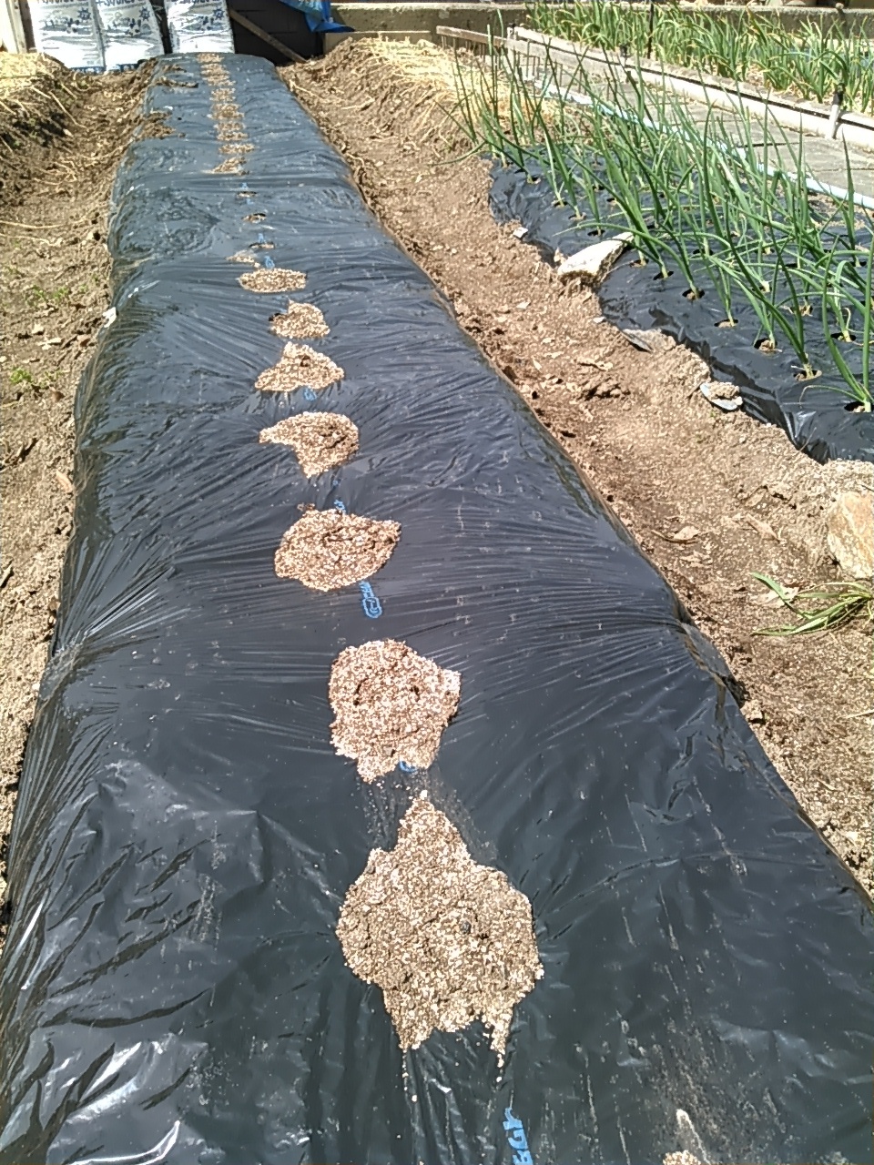 タマネギのマルチの穴から雑草が出てきているので、1穴づつ雑草を抜いてきました。