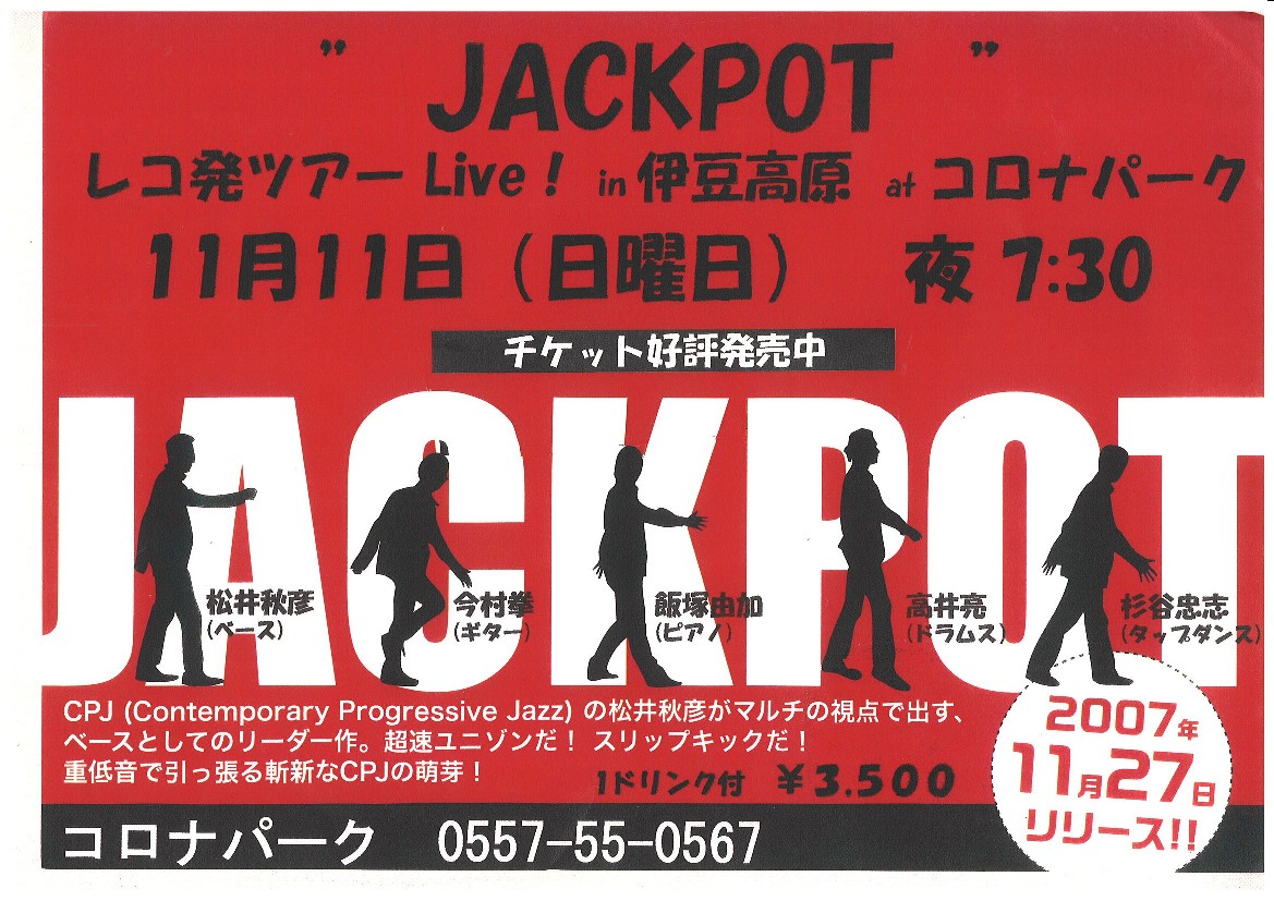 11/11(日)伊豆高原のコロナパークで”JACKPOT”LIVEがあります.夜7:30開演です.価格は1ドリンク付でお一人@3,500円です.Contemporary Progressive Jazzの松井秋彦さんが中心のユニゾンです.この他コロナパークではいろいろなミュージシャンのLIVEも行っています.12/4(火)は熱川ビューホテルにて17:30-20:30に特別LIVEもございます.乞うご期待ください.