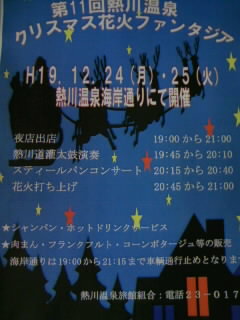 皆様、こんにちは、熱川温泉 月曜日担当 ムネ侍です。毎年恒例の『熱川温泉 クリスマス花火大会』LVE 花火の詳細が決定いたしました。今回も大切な方へのメッセージをインターネット公募いたします。締め切りは、12月20日(木) 午後3時応募先はこちらまで今年の熱川温泉は、細かいことは言いません。当日、熱川へいらしていただける方を対象に公募いたします。是非是非、御応募下さい。優秀作品には、来年のクリスマスに利用できる。熱川温泉 利用券をプレゼントしたします。