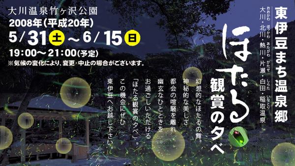 本日で「ホタル鑑賞の夕べ」が終了しました.開催した当初は雨にたたられましたが,後半は順調に日程を消化しました.このホタルイベントが終わるといよいよ海開きと花火大会で夏の熱川温泉のプロモーションが始まります.今年も恒例の「熱川温泉海上花火大会」は7/22・23の両日に行われます.宿泊プランは「楽天トラベルの花火特集」か「YAHOOオークション」などで検索ください!